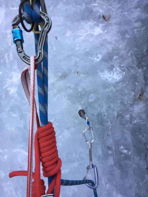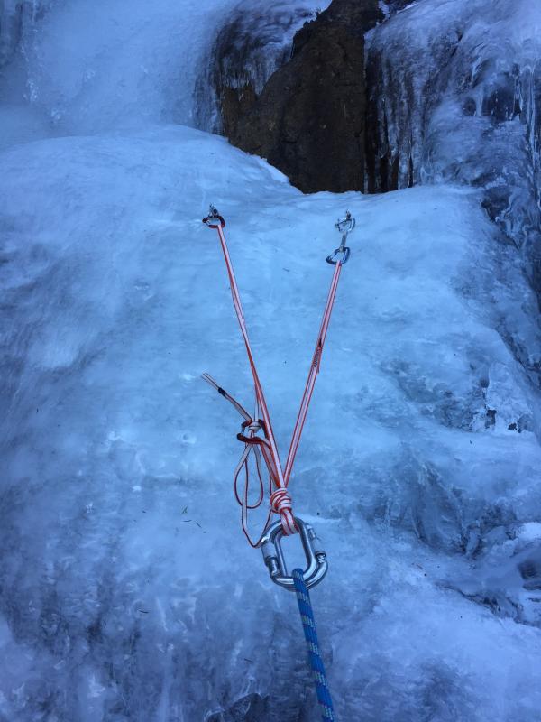 トップロープは立木や、アイススクリュー+V字スレッドで作成可能です。