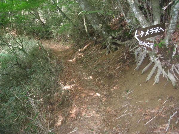 沓切沢橋より少し登山道を登ったところに、ナメラ沢入口の道標があります。
