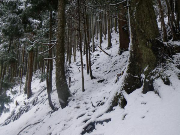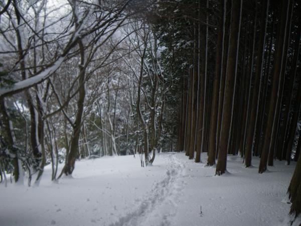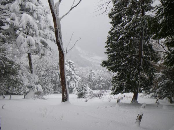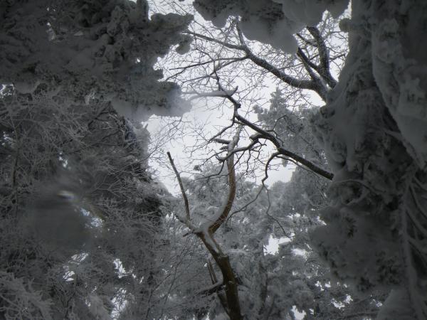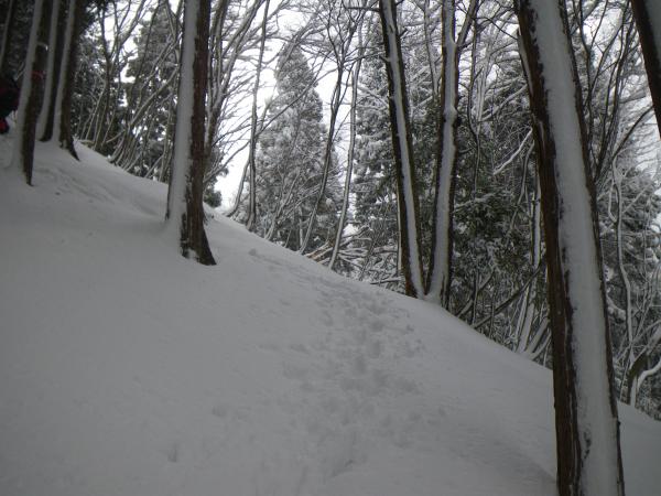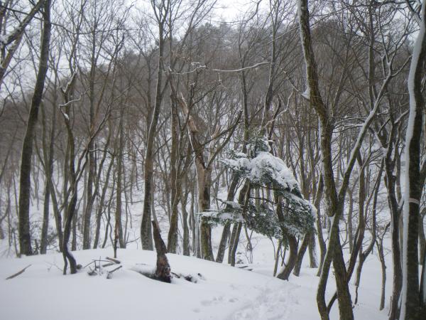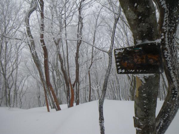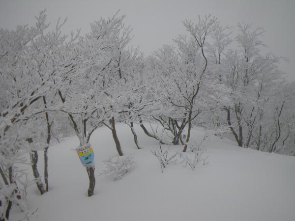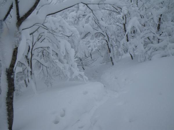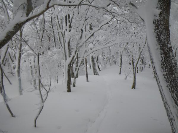 武奈ヶ岳(ぶながたけ・1214m)を目指しました。今回はバスの為、9:45に坊村からスタートして、武奈ヶ岳14時でイン谷口17時30分下山という概算で臨みました。しかしながら、雪が深く、思うように進めず、御殿山(ごてんやま・1097m)で13時になってしまい、ここから1時間では武奈ヶ岳には到達できないだろうし、坊村に帰るなら今しかないということでここで終わりました。御殿山から先のワサビ峠手前まで偵察しましたが、相変わらず雪が深く、雪も深々と降り続けるし、何も見えないことを考えると得策でしょうか。先行者と交代とはいえ、846mピークから手前から雪が深くなり始め、トレースも埋まっていた感じからすると厳しい様相でした。