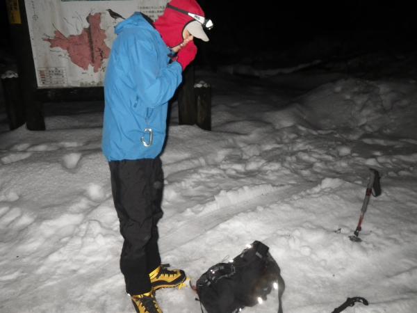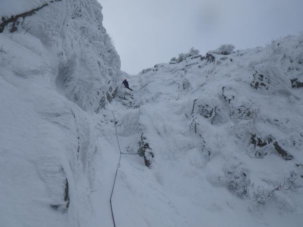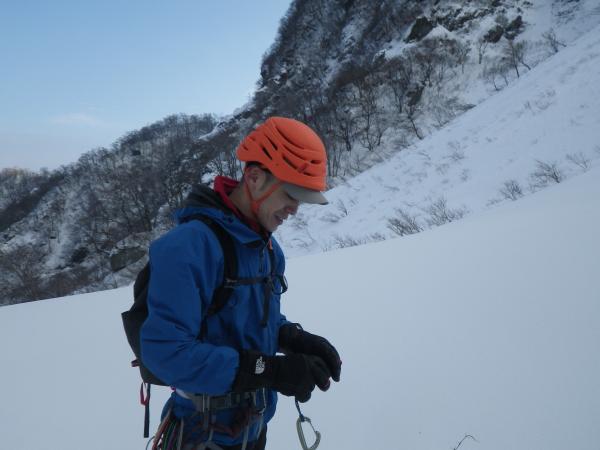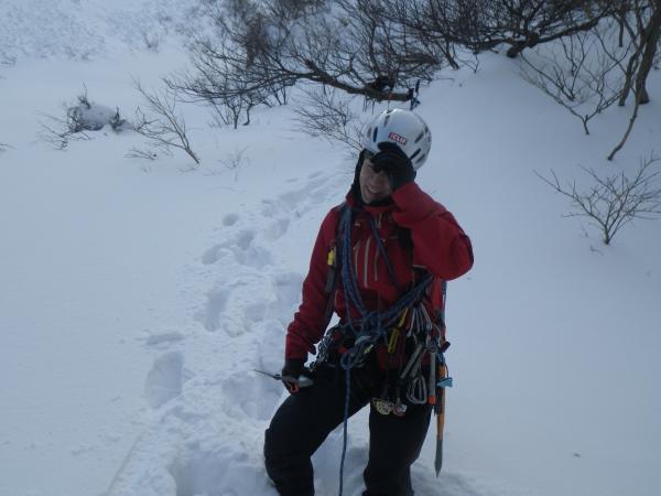 ラッセルで道を切り開くと弱層がくっきり・・・。あまり登攀の面でも状態は良くないですが、取り付きへ。何とか強固な支点を発見し、1P目。