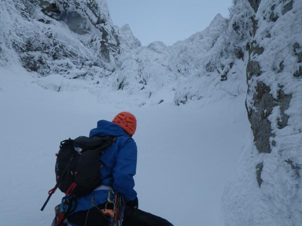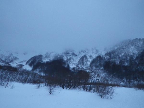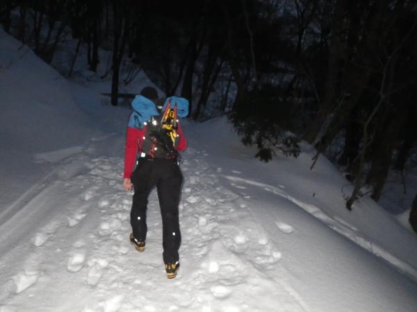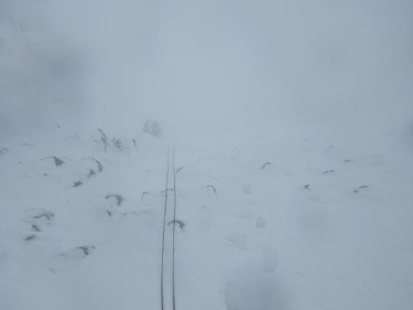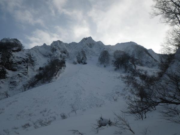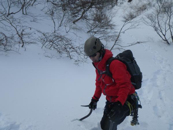 三鈷峰西壁の雪は氷結しておらず、ルンゼ内はラッセル。