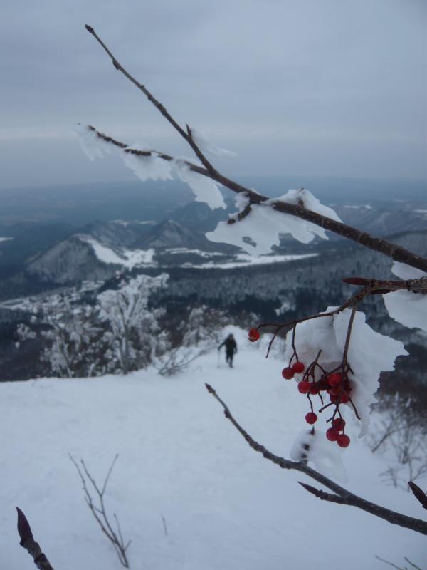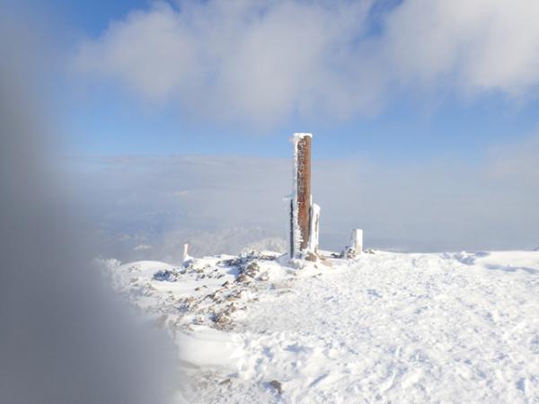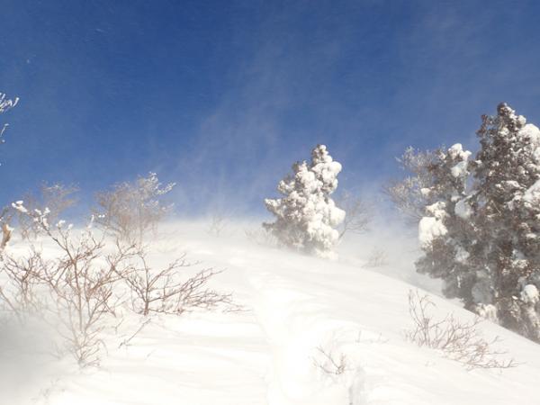 中峠からの稜線沿いは風が強く雪が舞ったり、顔に冷たい風が当たったり結構寒かったです。バラクラバは必要です。コヤマノ分岐から山頂までは急坂が続きます。体が少し押されて姿勢が崩れるほどの風が山頂付近に吹いていました。
