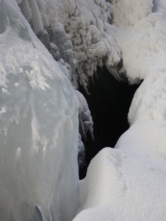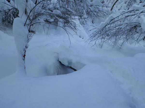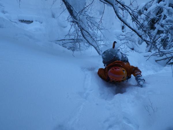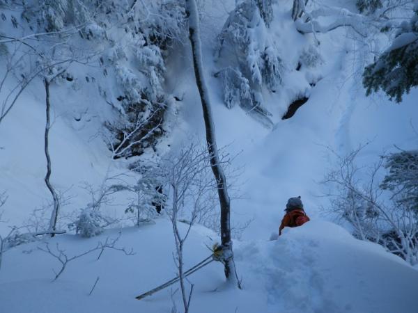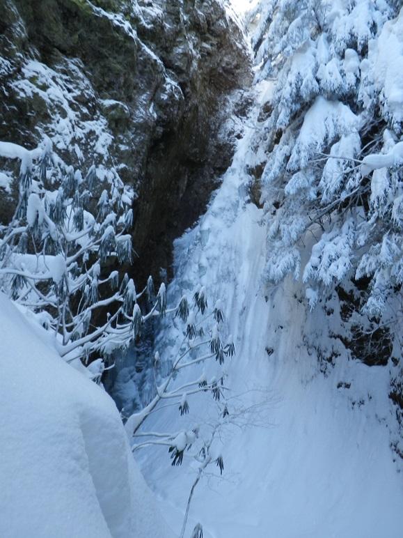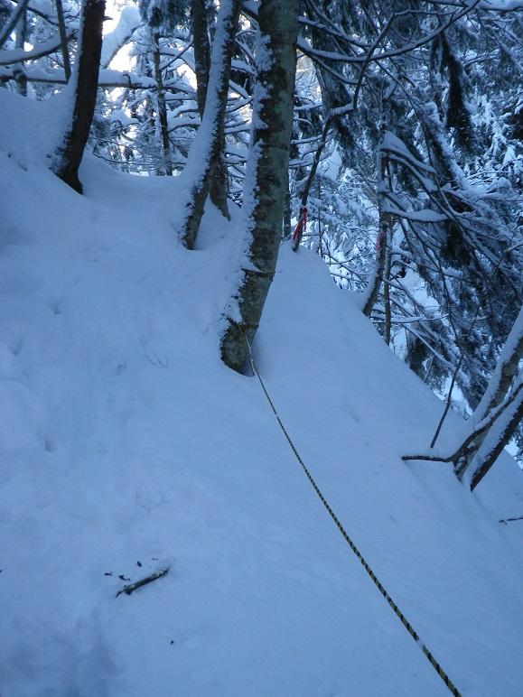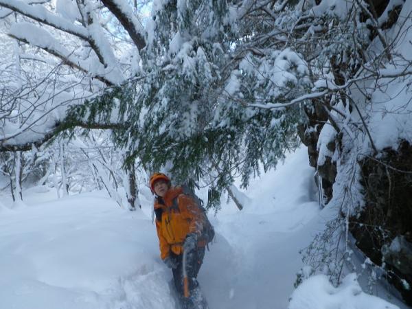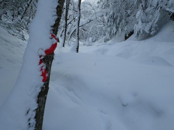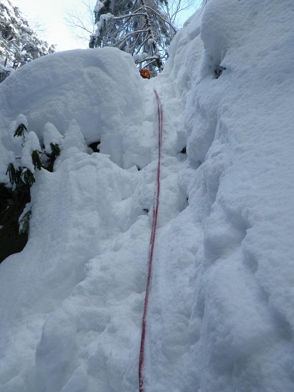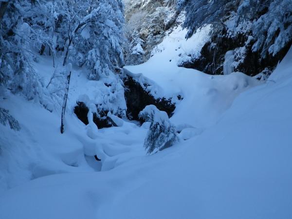 河原木場沢自体も近日な踏み跡なしでひざ上。赤テープあり。氷結は弱く、特に中間部は脆い。