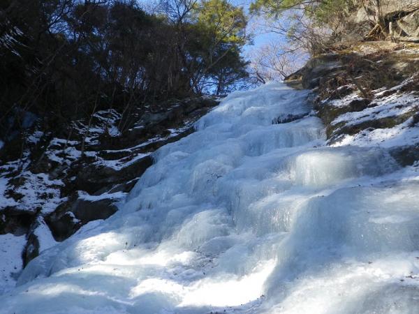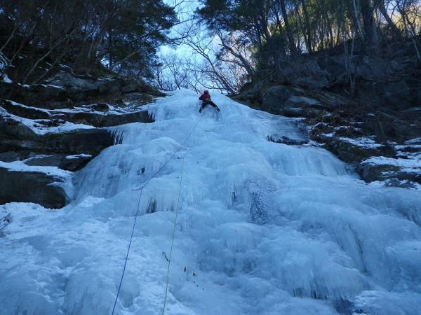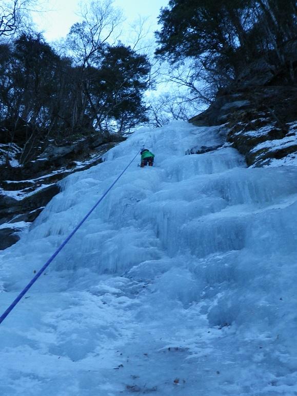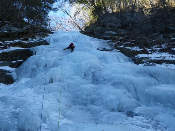 今年の日向山林道もゲートよりだいぶ下までしか車は通れないが、それでも東京からアプローチは近い。足尾はいいらしいとか心うごめくものがあったが、今日はアイス1年生の登りこみに付き合う。錦はトップロープではいける。F2は薄いのでラインが限られ、流水がある。