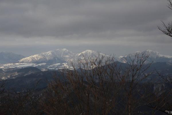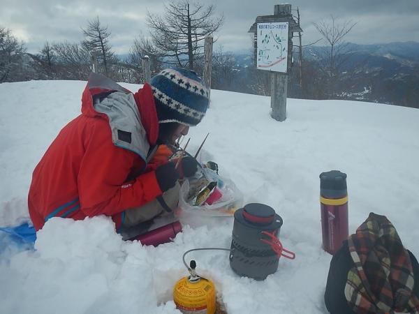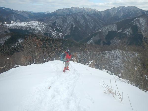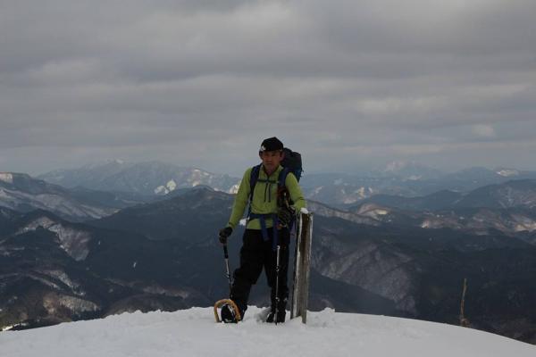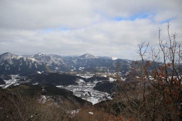 展望が素晴らしい。湯原の町、ゆきを被った山山、気持ちのいい山です。