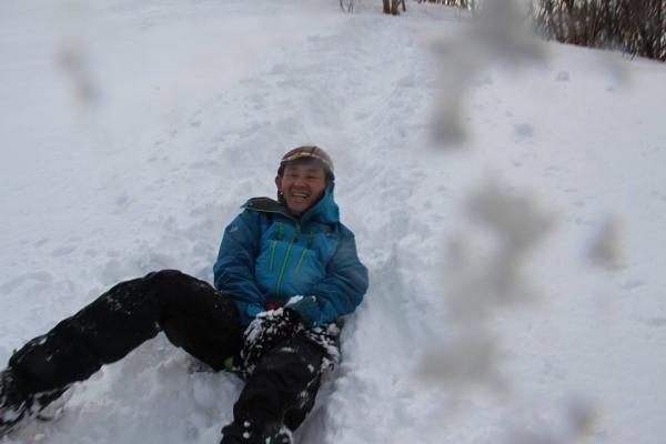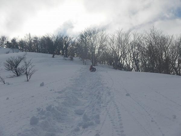 下りはそりで遊びます。ふわふわすぎて進まない・・。