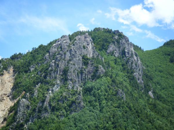 高度を上げると、川の対岸に大きく聳え立つ烏帽子岩が目に入ります。