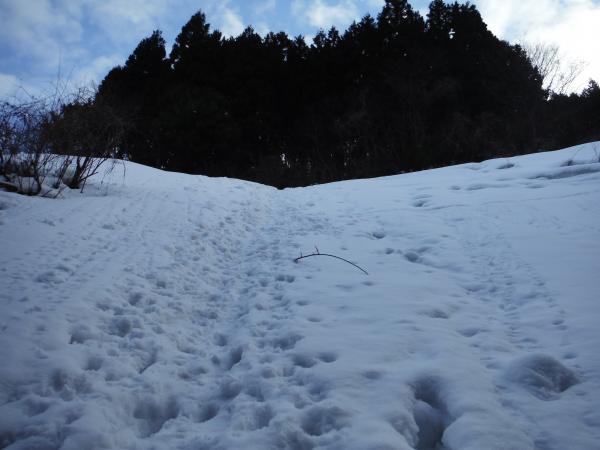- 大蔵山山頂までは完全なトレースあり。菅名の縦走路も若干のトレースはありましたが、菅名からの下山路の丸山尾根はほぼ消えていました。この尾根は急なので慎重に。椿平を過ぎるとトレースが復活、どっぱら清水までは一般の方も多く入るようで綺麗に道が出来ていました。