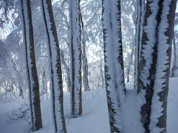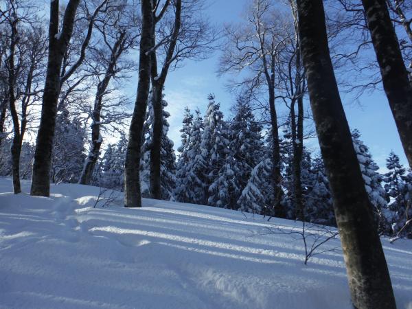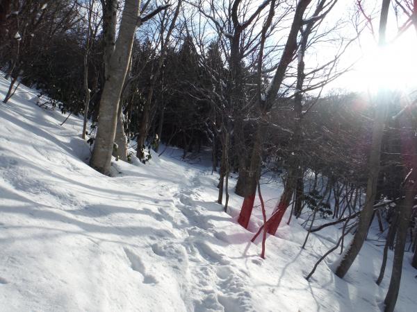 登山道に入ると朝の陽光差し込む穏やかな森の道になります。綿帽子を被ったような菅名岳が、時折キラキラと顔を覗かせていました。山頂から早く景色を眺めたい!とつい速足になってしまいそうでしたが、ゆっくり歩かないと枝に積もった雪が今にも上から落ちてきそうだったので、急ぐ気持ちを押さえて慎重に登りました。