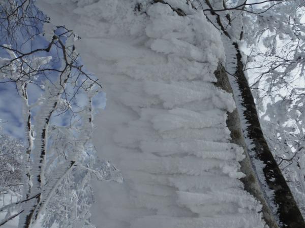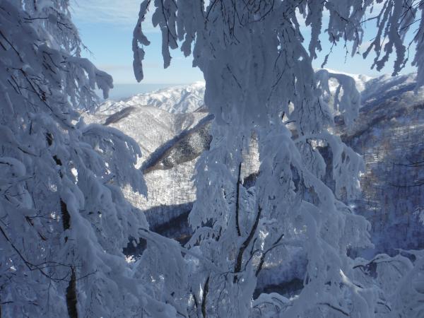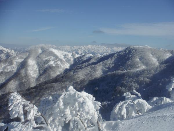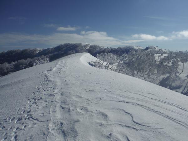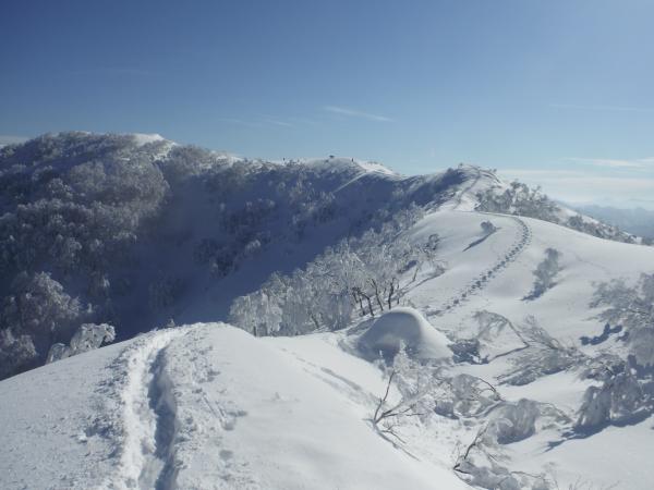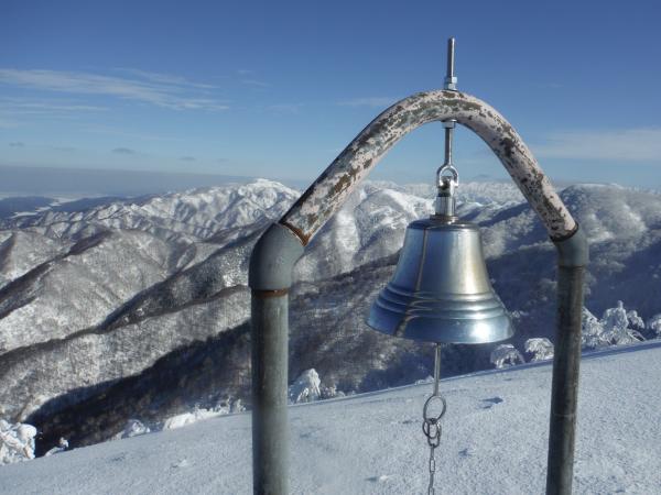 そしてついに山頂へ!期待通りの青と白の世界です!この前見れなかった飯豊連峰や、お隣の白山、粟ヶ岳もくっきり。鐘を鳴らして腰を下ろしていると、先に休憩していた方々が菅名目指して歩き出しました。「こんな良い日に縦走しないなんて勿体ないわよ!」そう背中を押され、大蔵だけのつもりでしたが菅名まで行ってみることにしました。