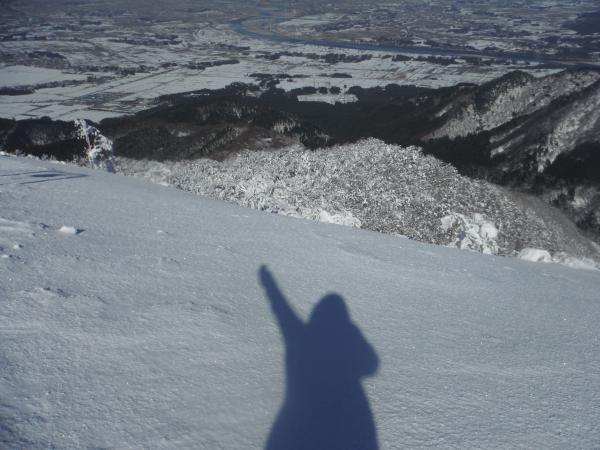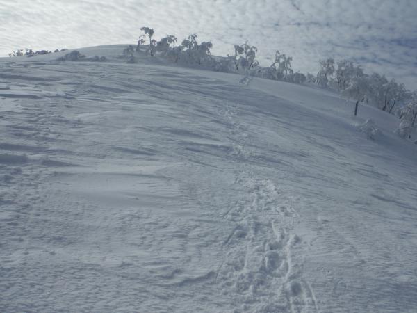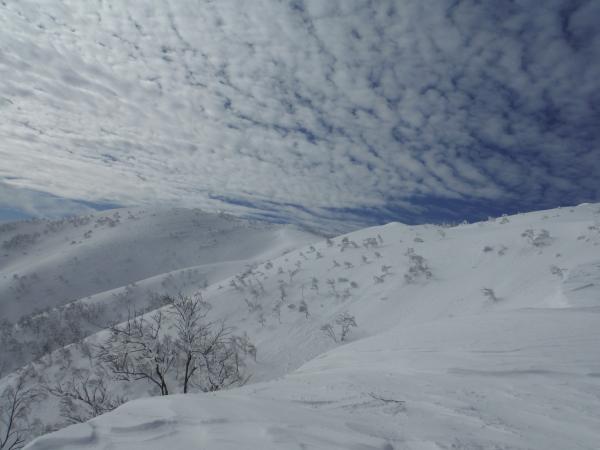 お昼を食べ終えると徐々に雲が多くなってきました。十分堪能したことだし長居は無用、今度は私が先頭きって下ることとなりました。トレースは無い上に急だったので、この日一番の集中力でもって注意深く観察しながら下山しました。