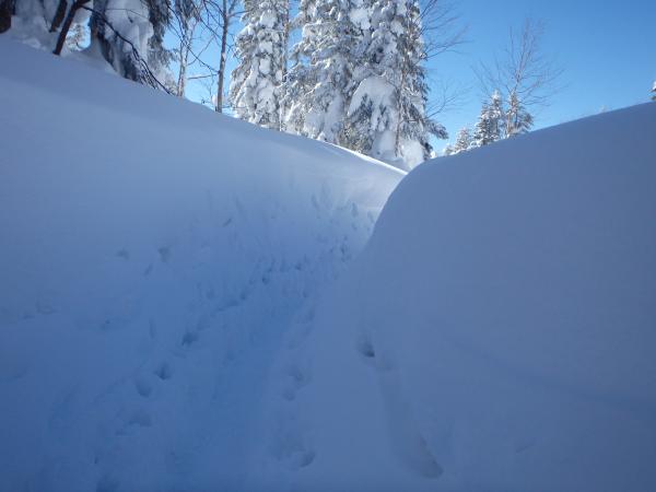 前に人が歩いているはずなのに、トレースはすぐ消えて竹の目印を追う。