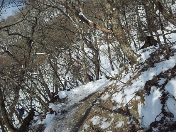 黒檜山~猫岩:いきなり急な勾配です。前爪のある10本以上のアイゼンがおすすめです。ちなみに雪で猫岩は見えません。