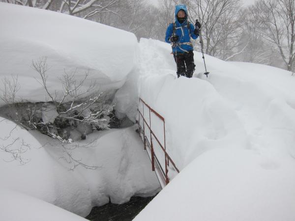 夏の記憶を頼りに土合橋の手前の駐車場への入り口を探すも見つからず、考えてみれば当然雪の下。