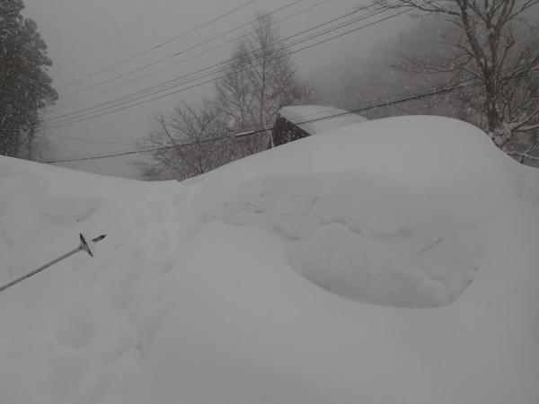 すぐに車道に出るのがもったいなく感じ、手前のトレースをたどってみるもまた埋まる…車道と合流する気配なし…。土合山ノ家に向かう踏み跡のようです。