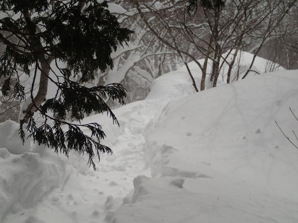 ・連休最終日で、先行者がいらっしゃったためトレースあるも、雪は深い。