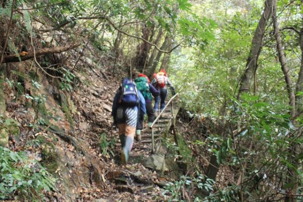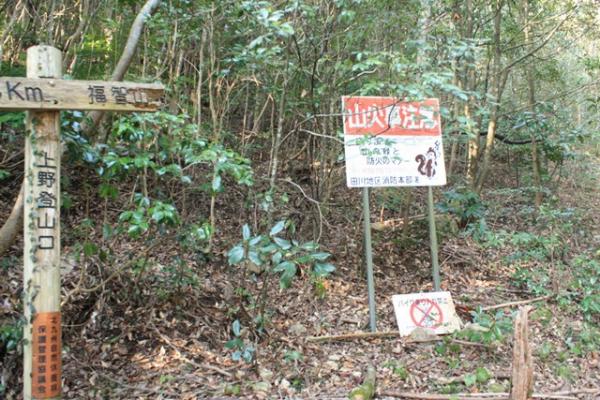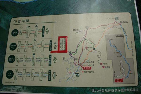 - 上野峡(20分)白糸の滝(120分)福智山山頂(45分)上野越(15分)林道(45分)上野峡
