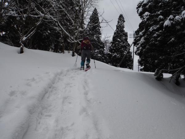 雪の無い時期はハイキングに丁度良い道で、歴史を感じさせる石畳が敷かれているそうです。今は積雪が2mを越えますが、集落の終点までは除雪されているので、そこからスノーシューやワカンで進むことができます。土屋ガイドはこの地域に精通しており、静寂に包まれた冬の森は特におすすめだということでご一緒させてもらいました(^^)