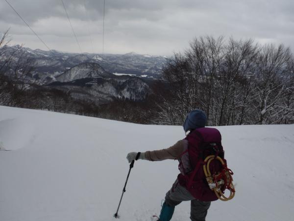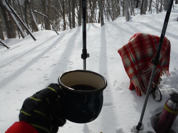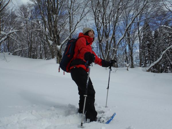 無名峰からは東側に聳える飯豊の前座の山々が白く輝いていました。ひときわ目立っていたのはやはり飯豊の最高峰・大日岳。南側に視線を移すと、会津方面にとんがり帽子の磐梯山、まだ登ったことの無い御神楽岳も真っ白でした。いつまでも眺めていたいところでしたが、じっとしていると本当に寒い!早々に下り、今度は木漏れ日差し込む森の中でカモシカ探し。足跡もあり、何となく気配はするものの姿は見えず。土屋ガイドは何度も見ているそうなので期待していましたが、この日はとうとう出会えませんでした。