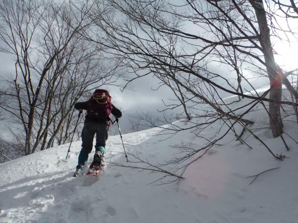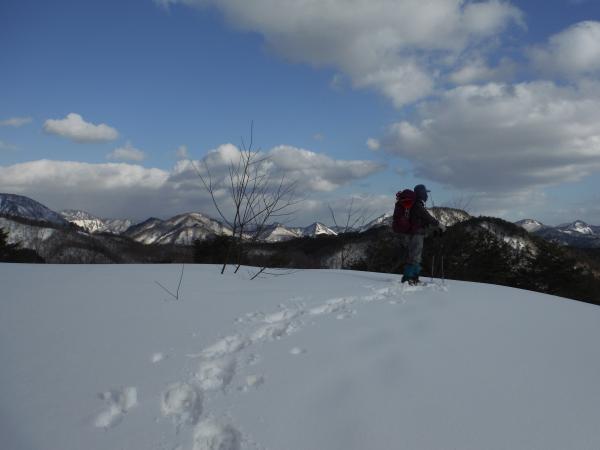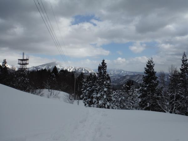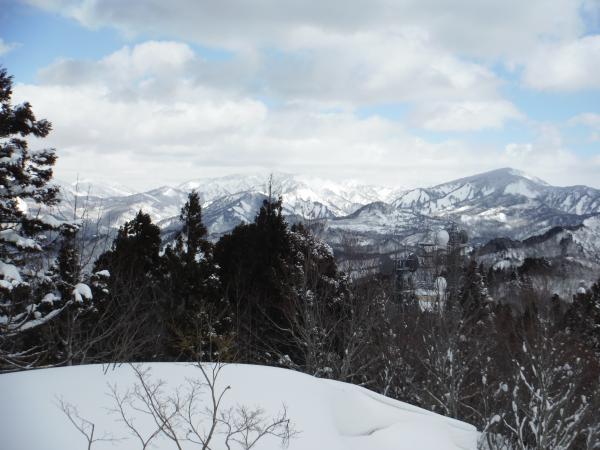 さらに進んだところに電波塔があり、丁度良い風除けになったので陰に隠れて休憩することにしました。そこからは一際高い棒掛山の勇姿を臨めます。そこからさらに登ったところに579mの無名峰があり、眺めが良さそうなので登ってみることに。途中我々に気付いた真っ白な野ウサギが慌てて逃げていきました。この日出合った動物は野ウサギだけでしたが、滅多に姿を現さないそうなのでラッキー(^^)でも驚かせてごめんなさい(;_:)