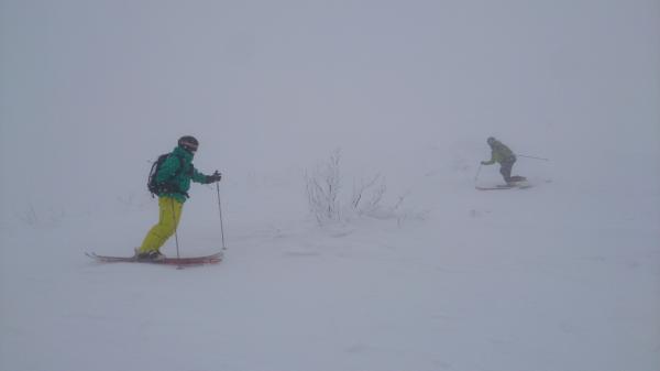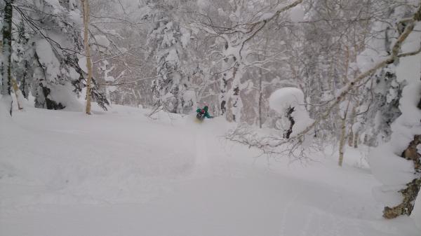 今回のハイライトは1258mから始まる南斜面。疎林帯で斜度も緩すぎず板が走り、皆夢中になりすぎて滑る方向がだいぶ逸れて登り返しする羽目になりましたが、快適なツリーランを楽しめました。