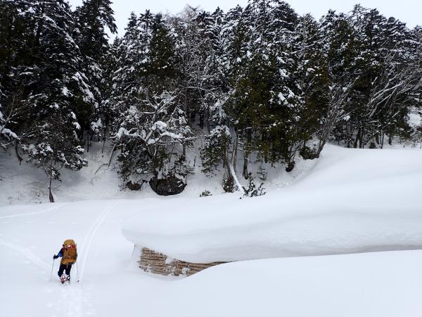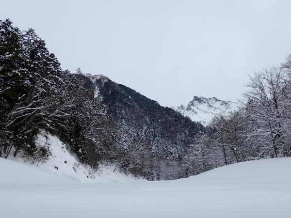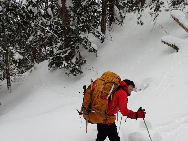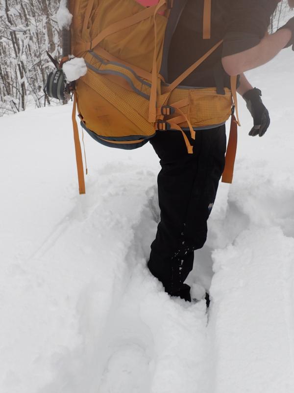 右俣林道ゲートから穂高平小屋までトレースはあったもののその先はトレースはなく湿って重たい雪の膝ラッセルは心を打ち崩されそうになりました。
