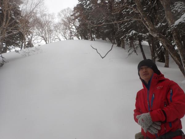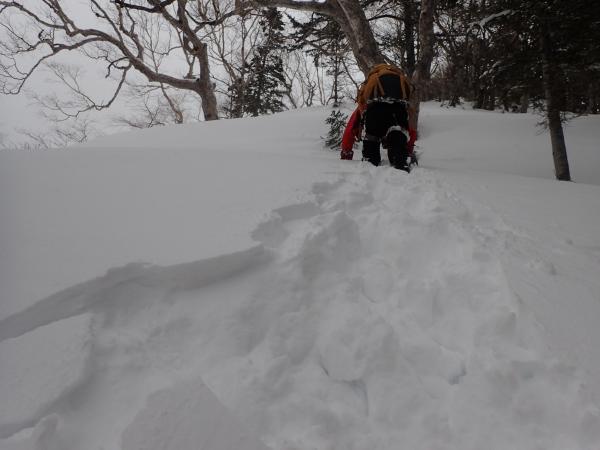 - 新穂高の右俣林道ゲートから膝の重たい雪のラッセル。穂高平小屋から先はノートレース。涸沢岳西尾根上は膝から腰時々胸の高さのラッセルが南稜との分岐まで延々と続きます。雪質が悪くて踏み抜きが多く苦労します