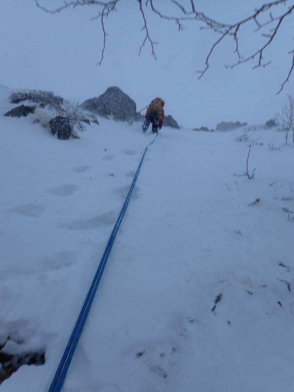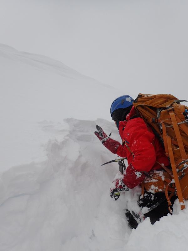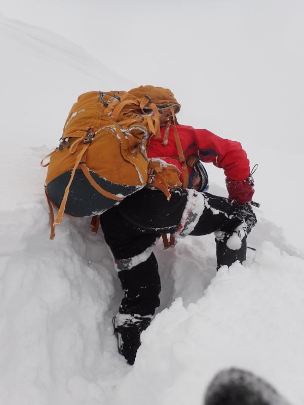 翌日、6時にテントをデポして出発2600mの南稜との分岐まで9時間もかかってしまい蒲田富士に行けるかどうかぎりぎりでした。風雪が強まる中のコンテで登るためロープやギア類の準備もあり、夕暮れも迫って天候がさらに悪化する前に岩稜を少し登って、せっかく出したロープを使って懸垂下降しました。