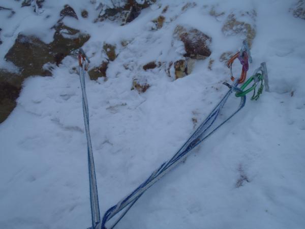 全体的に残置はほぼなく(もしくは雪に埋まっているので)キャメロット、イボハーケンが有効です。また、1ピッチ目には短めのアイススクリューも有効。