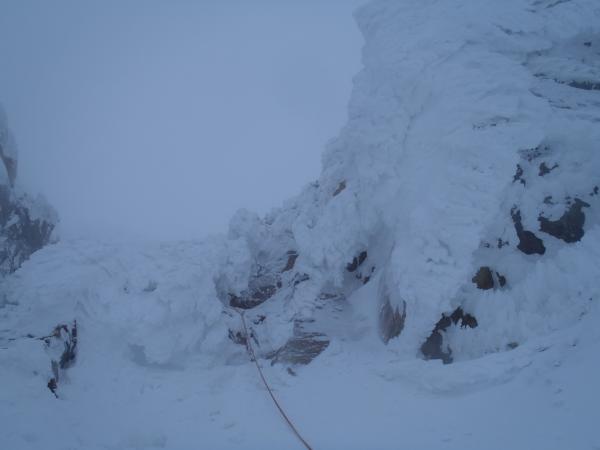 三段ルンゼは全4ピッチ1P目が核心、おもしろい氷が発達しています。