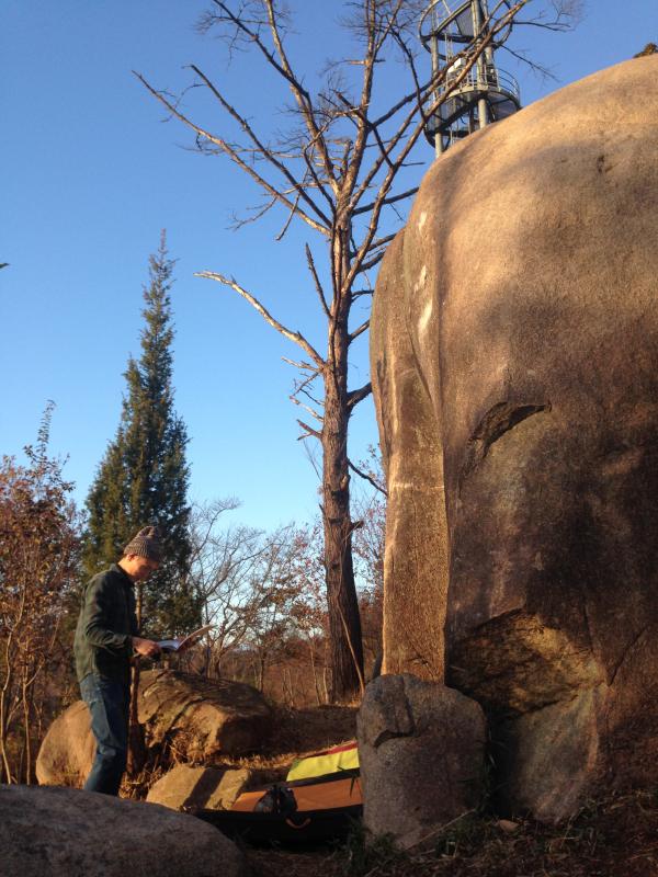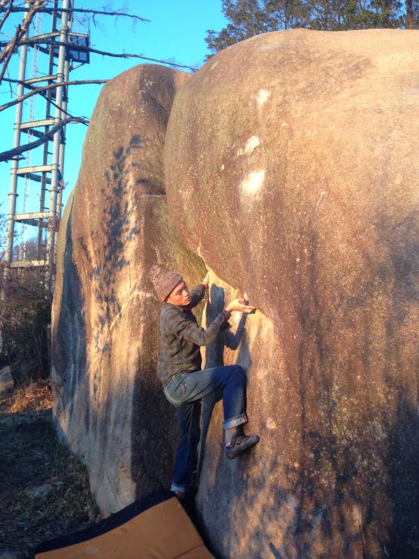 その後、鉄塔エリアに移動してビンゴ(2級)にトライ。登った人は皆面白い課題だ、という評判の課題。足の置く位置が絶妙で面白い。今回は完登できませんでしたが次回もまた挑戦したい課題でした。