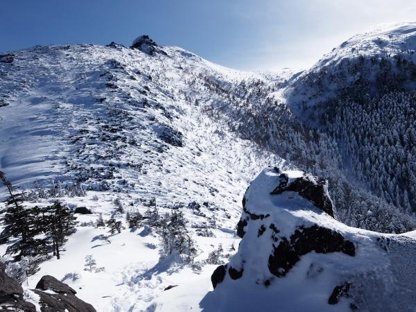 天狗岳手前には大きな急な雪面、岩稜帯があります。