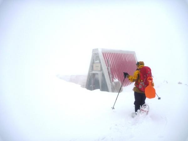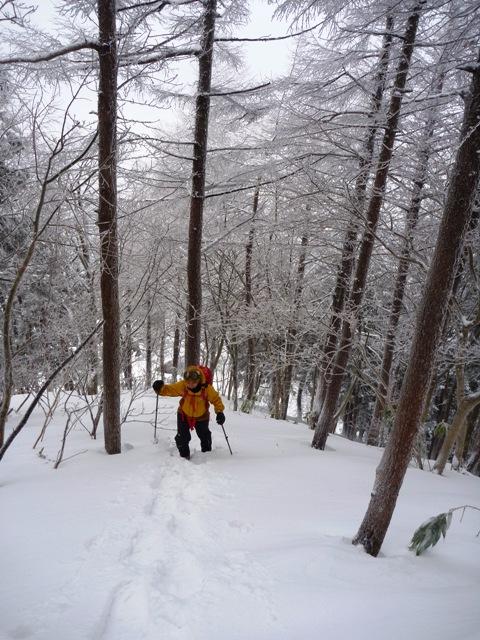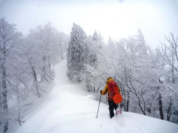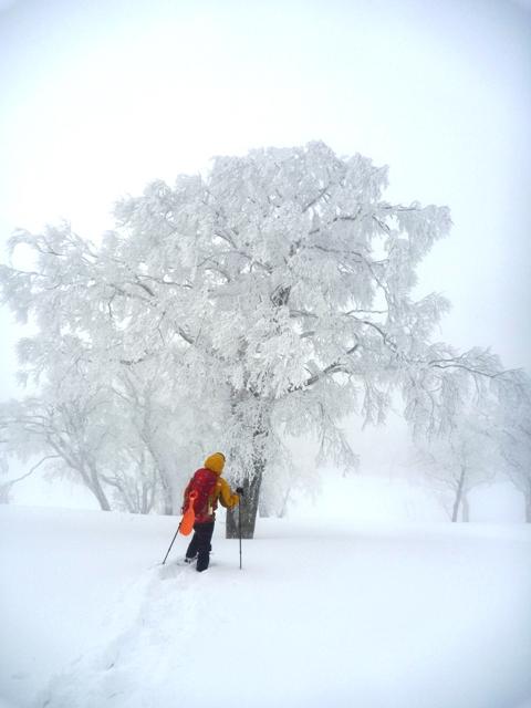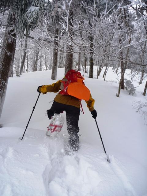 視界がきかないので頂上は断念しました。それでも軽い雪でスノーシューを楽しめました。