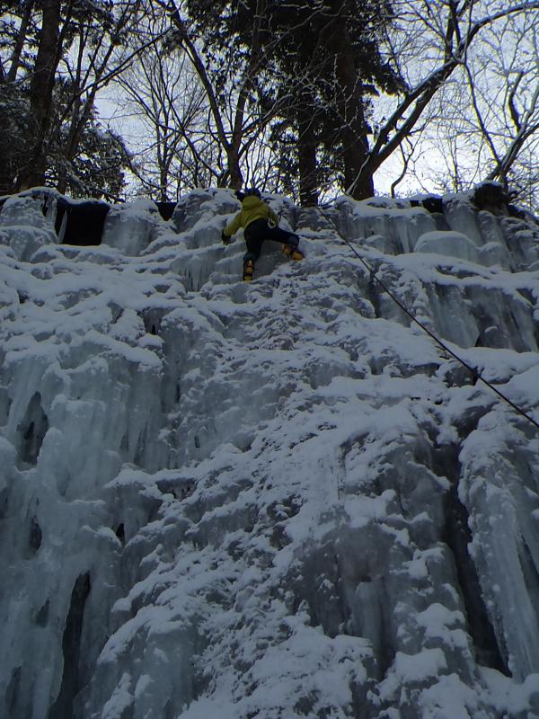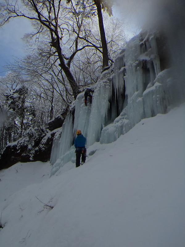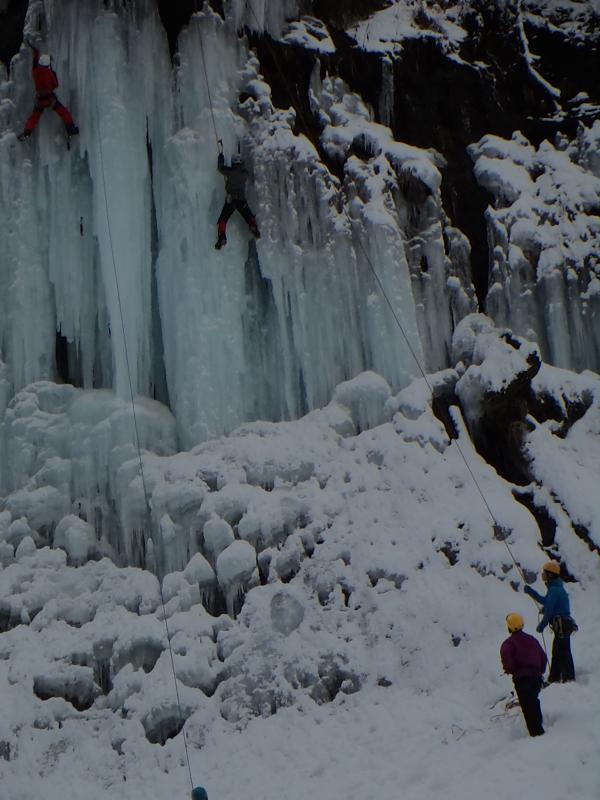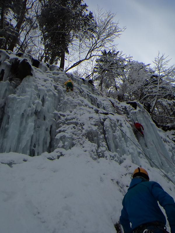 人が多い場合は、登っている人が落とす氷に注意が必要です。ヘルメットをしているとはいえ、大きい塊が普通に落ちてくるので当たるわけにはいきません。登る人も無理して突っ込み過ぎず、氷が薄かったり、壁に張り付いていない所は登らないように避けるべきです。あと譲り合うことも忘れずに。
