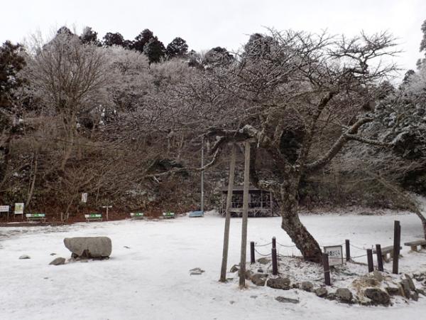 山頂広場は積雪量こそ少ないですが、カチコチに氷っていてまるでアイススケートで使うスケートリンクのようでした。霧氷は所々ありました。