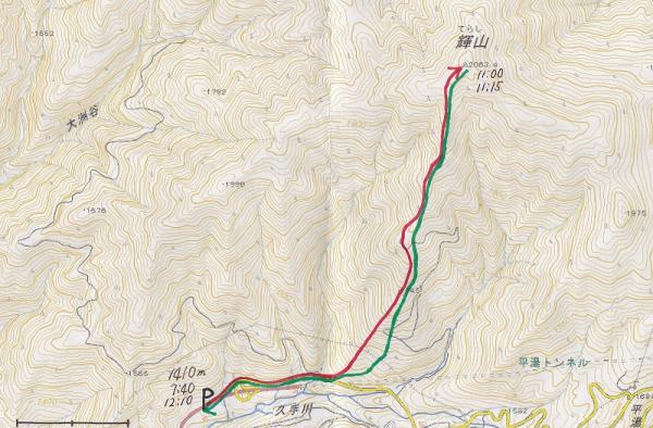 - 平湯トンネル西側入口1410m発7:40→(200分)輝山山頂2063m着11:00~