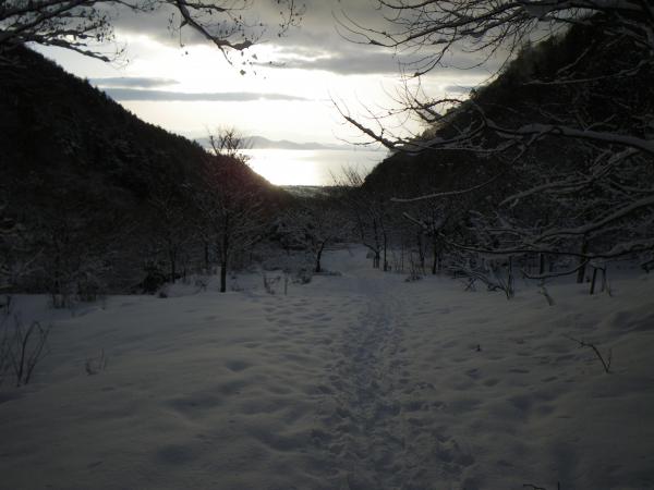 武奈ヶ岳には予定通り昼に到着、ここからは西南稜で坊村へ。西南稜も今日は登山者が多く、トレースがあり、また雪質も恵まれ、あっという間に御殿山。ここからは前回と同じ道で下るも、雪質が前回と違い、アイゼンがベストの歩きやすさで、余裕で坊村へ下りました。前回と違い早く、下山して、リベンジ成功です。空いた時間で、坊村の喫茶店で食事をしました