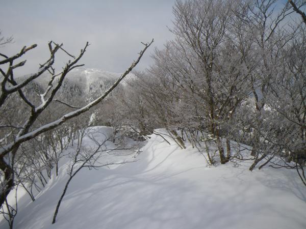 武奈ヶ岳へは琵琶湖側と朽木側とあります。今回も電車ですが、前回とは逆コースで坊村15:46のバスに乗れるかというので、今度は琵琶湖側からスタートしました。こちらからは何回も行っていますが、今回は降雪後ということで、トレースの上に雪が積もり、トラバースする箇所は消えていました。しかし、坊村からのコースと違い、見覚えがあるので安心です。北比良峠~八雲ヶ原間は特に樹林帯で完全にトレースはなしで、ワカン歩行。八雲ヶ原からは旧比良スキー場のスキーコース沿いが歩きやすそうなので、そちらから。あまり埋まることなく、スムーズに分岐まで行けました。このあたり、降雪後で樹氷の世界できれいです。