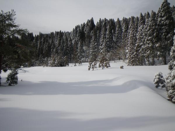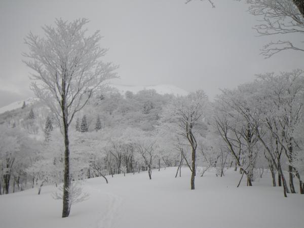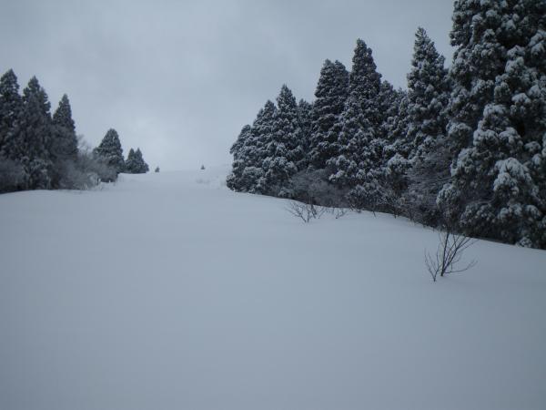 ⑥八雲が原~旧ゲレンデ間は樹林帯沿いに上がるが、今回はここもトレースがなかった