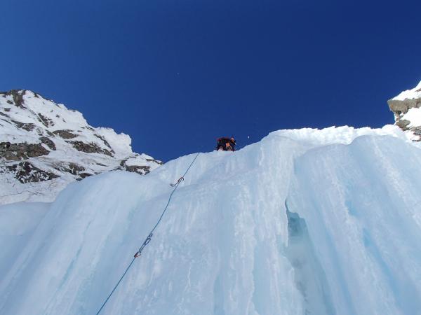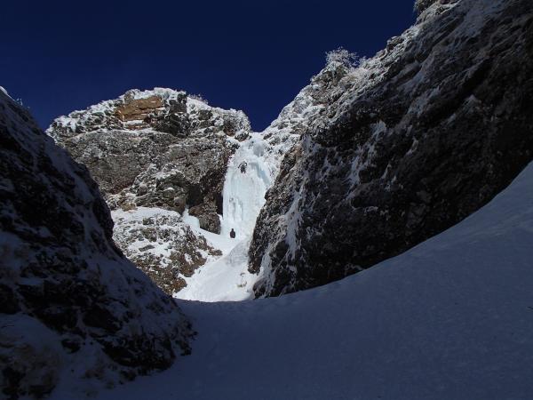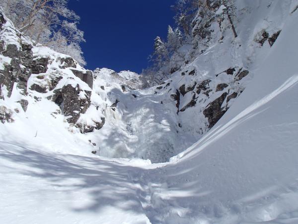 大同心ルンゼの大滝は下部は完全に雪に埋まっていましたが上部は登れます。