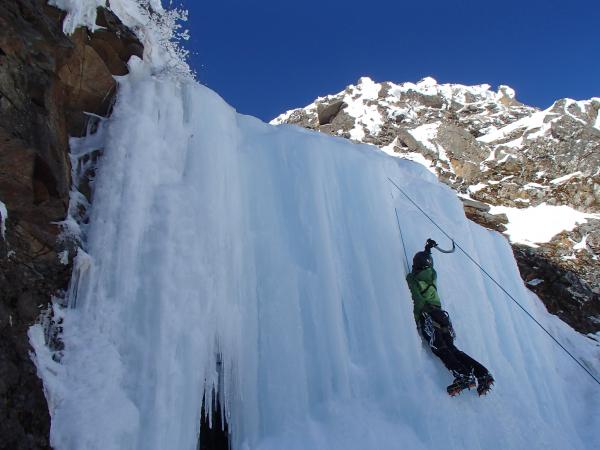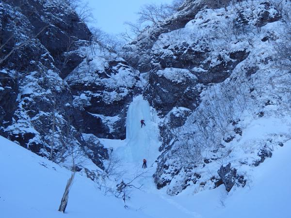 一日目はジョウゴ沢。F1,F2を登り、F3へ。F3は雪に埋まっており、どこかよくわかりませんでした。その上の乙女の滝、ナイアガラの滝はばっちり凍っていました。今回はナイアガラへ。滝を登り終わったところの左側にボルトが2本打たれており、トップロープもセットしやすいと思います。