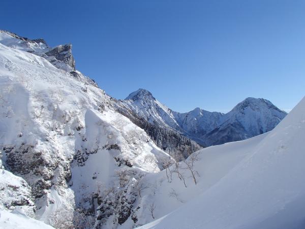 二日目は大同心ルンゼ。大同心大滝へのオプローチは約一時間。大滝は下部の氷は埋まっていましたが、上部はしっかり氷が出ていました。