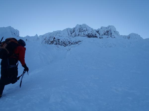 正面壁までは雪面もしまっていたためラッセルもなく順調に到着。威圧感のある正面壁が目の前です。