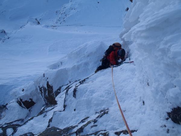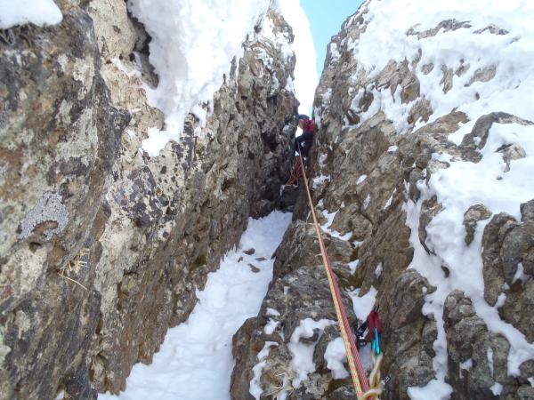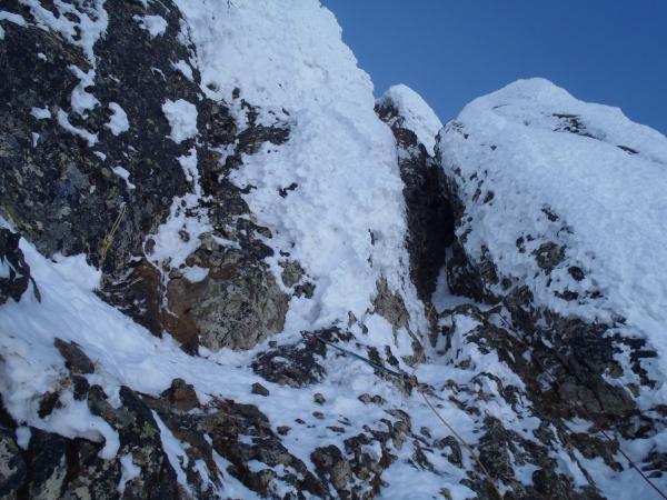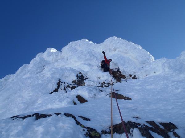 1P目は特に雪付きが少なくバランシーな場面やスリリングな登攀が楽しめます、下部のワンポイントは