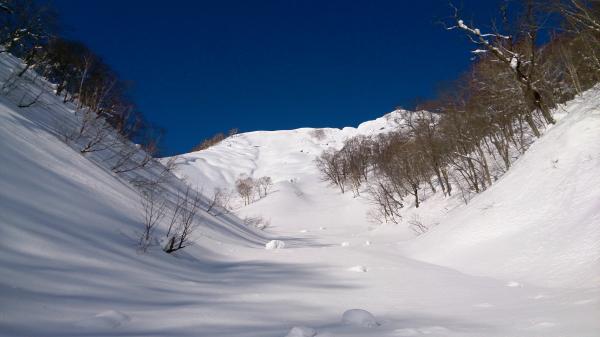 そのまま谷を直登するかと考えましたが、近づいてみると、斜面にシワが寄っていて雪庇の下に横一線にクラックが…。