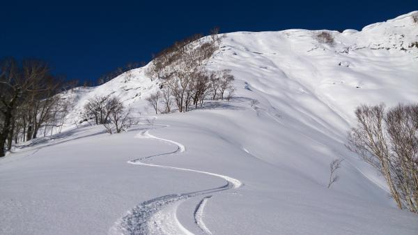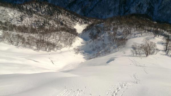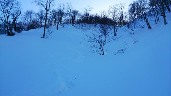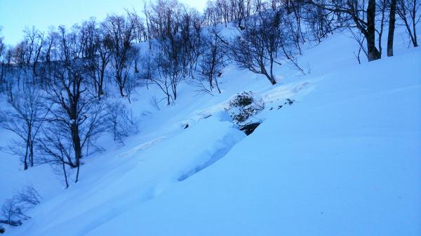 浦臼山からは490m地点まで下り、そこから北東に延びる沢筋を滑りましたが、比較的下部でもクラックは発生しており、この山域全体雪の状態が脆くなっている印象でした。
