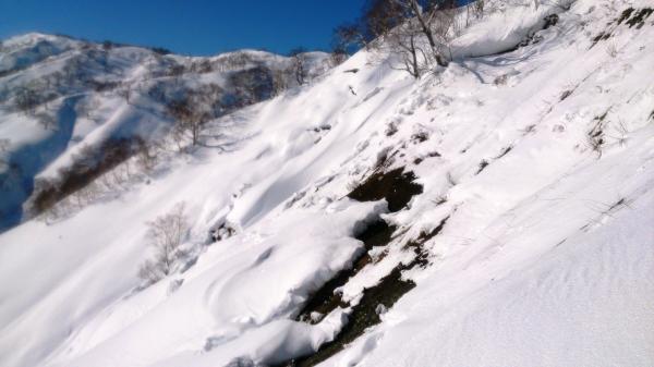 谷を詰めるのは危険と判断し、右岸の尾根を登りましたが、尾根までクラックは及んでおり、稜線直下650m付近で万事休す。尾根筋を滑って橋まで戻りました。