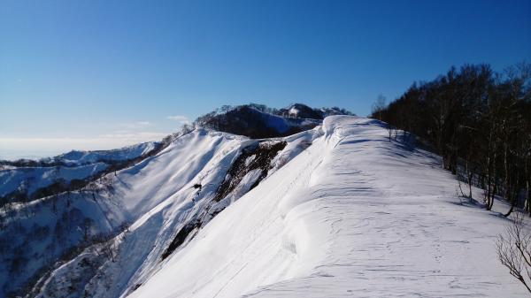 浦臼山の稜線は南東面に雪庇が大きく張り出し、さらには全層雪崩の起きている斜面もありました。