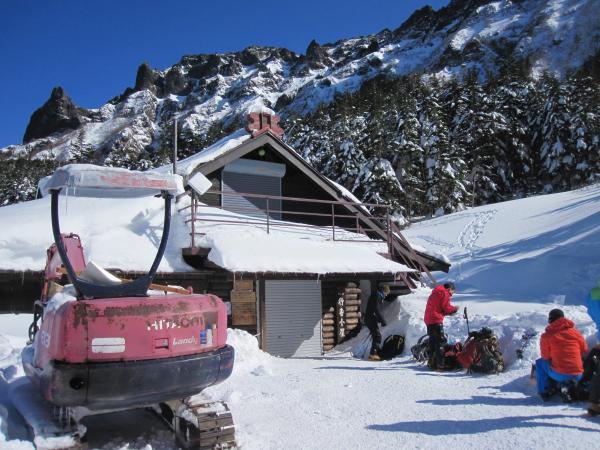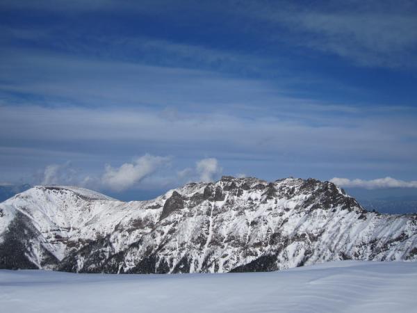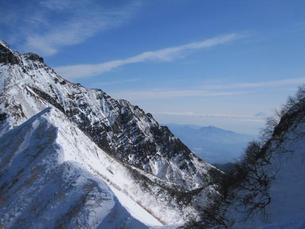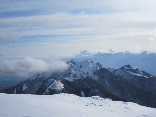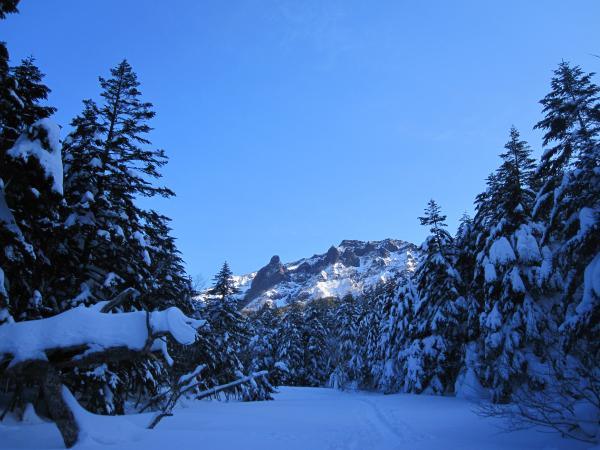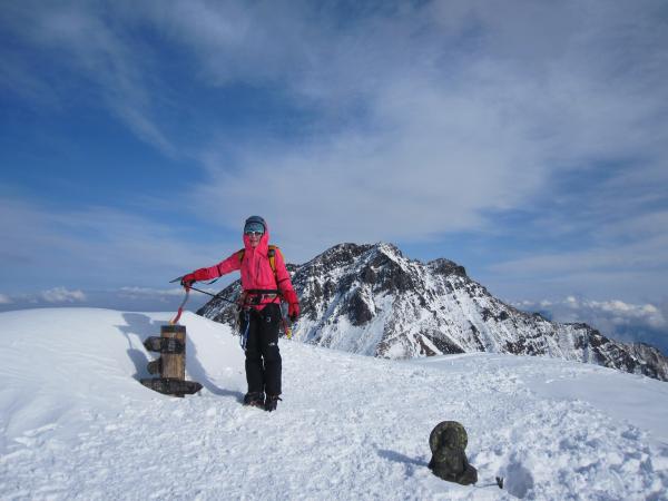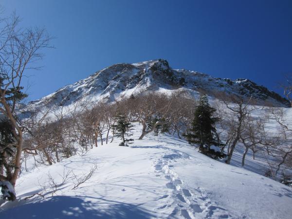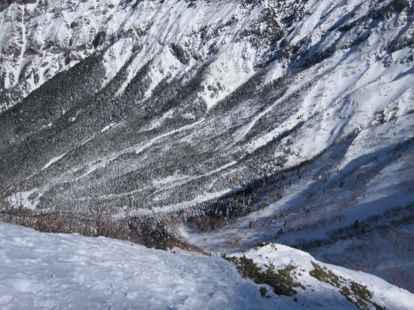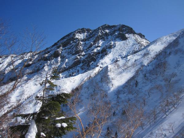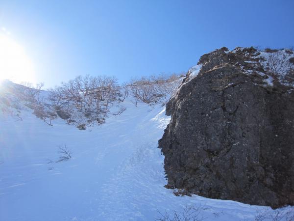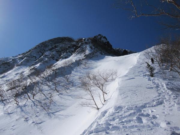 - トレース明瞭で登りやすい。トレースが無かったら膝位のラッセルになると思います。一般ルートを分かれてから右手の樹林帯の急な登りです。第二岩稜(『チャレンジアルパインクライミング』の第一岩峰に相当)は2Pで登り途中に大きなテラスあり。短いので不慣れな私でも何とか登り切りました。最初の取り付きが足場が悪いので注意。その後ナイフリッジ、稜線直下はそのまま一気に直登。下りは一般ルートで中岳沢のコルへ。かなり急なので慎重に。途中岩肌が出ている箇所は後ろ向きのダブルアックスが楽でした。中岳沢は時期によって雪崩れる可能性あり。素早く通りました。