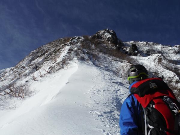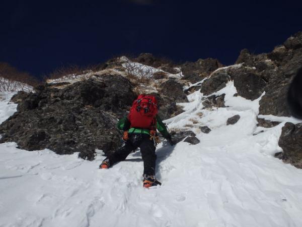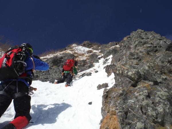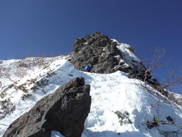 さらに続く岩峰。ひとつ目の登り出しが緊張を感じる登りになりました。正面左手側の溝を登ったのですが手が少なく私のレベルではコレ以上だと楽しめないなぁ。怖さが先行してしまう。そんな感じでした。ベントタイプのピッケル2本使うと少し楽だそうです。これは無理!と思ったら巻き道に逃げる勇気も必要です!